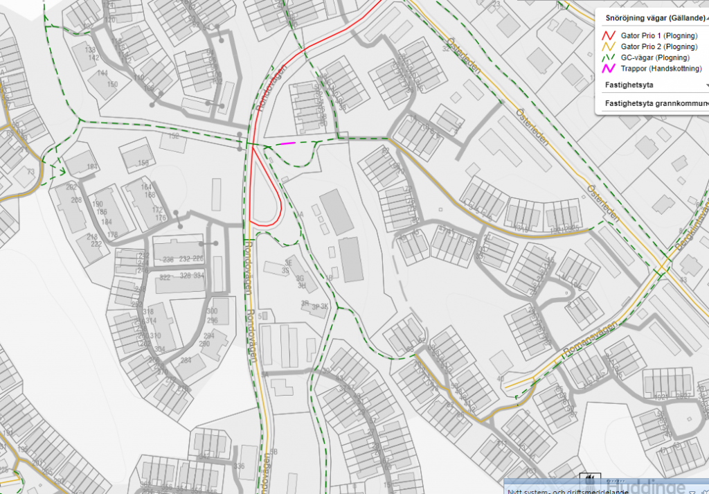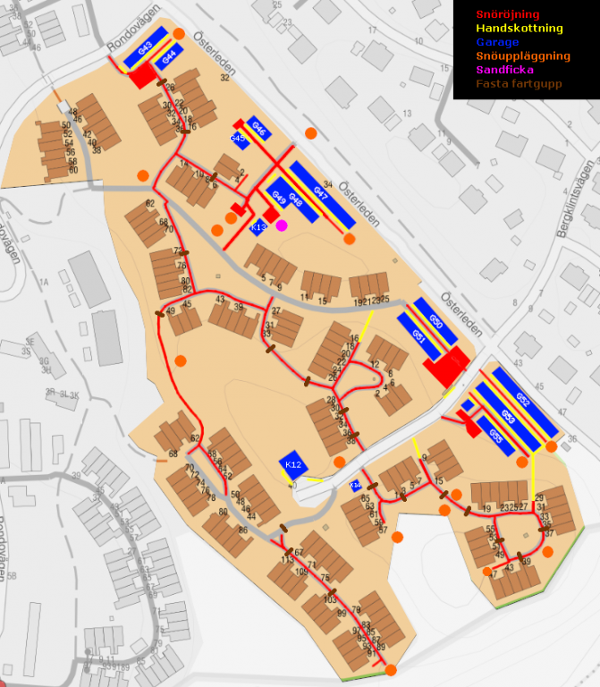 Vissa gator inom samfälligheten tillhör dock inte oss utan kommunen. Kommunen snöröjer/sandar dessa gator som kallas brandagator. På bilden nedan är de gator som är markerade med färg kommunens och de olika färgerna är hur kommunens entrepenör ska prioritera sin snöröjning. Entrepenören kallas t.ex. ut vid 2cm på Prio1-vägar eller 8cm lätt-snö/4cm tung snö på Prio2-vägar. Minst 16 timmar efter påbörjad utkallning ska alla vägar vara röjda (2022)