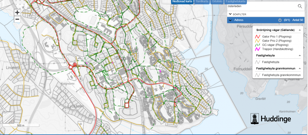 För den intresserade finns här även en bild på vilka vägar inom hela Östra Skogås som kommunen ansvarar för .